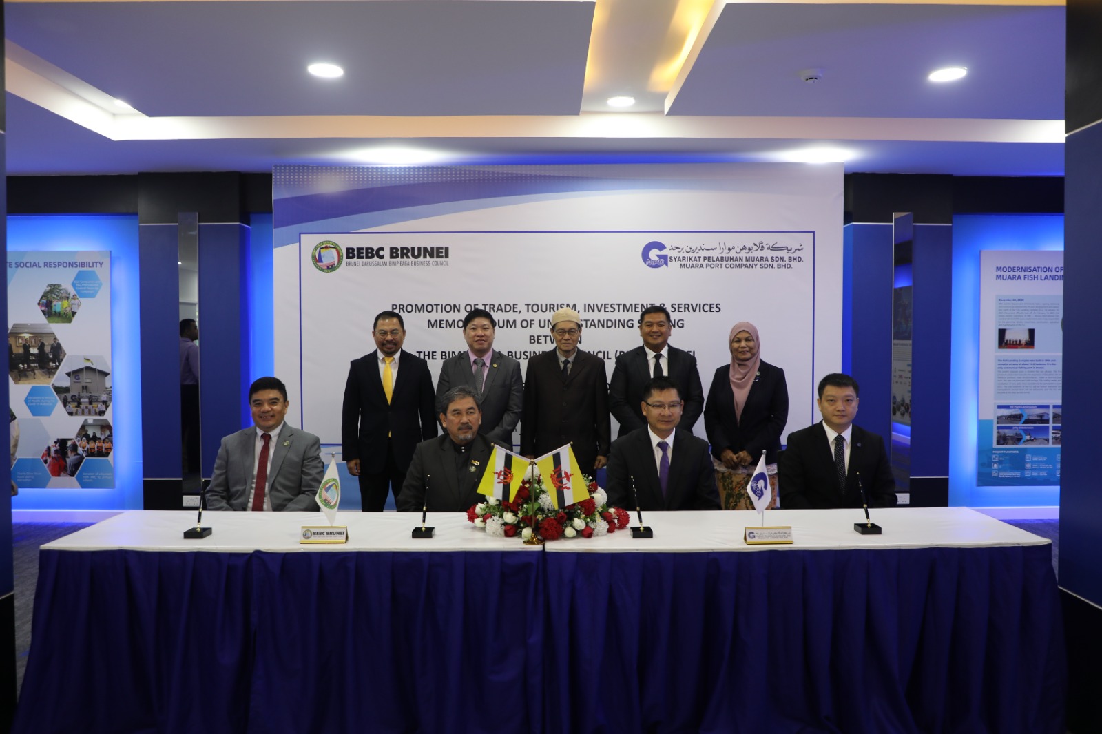 Signing on behalf of the BEBC was Yang Mulia Pg (Dr) Haji Haris bin Pg Hj Duraman, Chairman of BEBC Brunei, while Muara Port Company (MPC) was represented by Yang Mulia Mr. Zeng Caili, Chief Executive Officer of Muara Port Company Sdn. Bhd. Witnessing the signing ceremony was Yang Mulia Awang Hj Alimen bin Hj Jaafar, BEBC Brunei - Country Director, and Yang Mulia Mr Lyu Guoli, Chief Financial Officer of MPC.